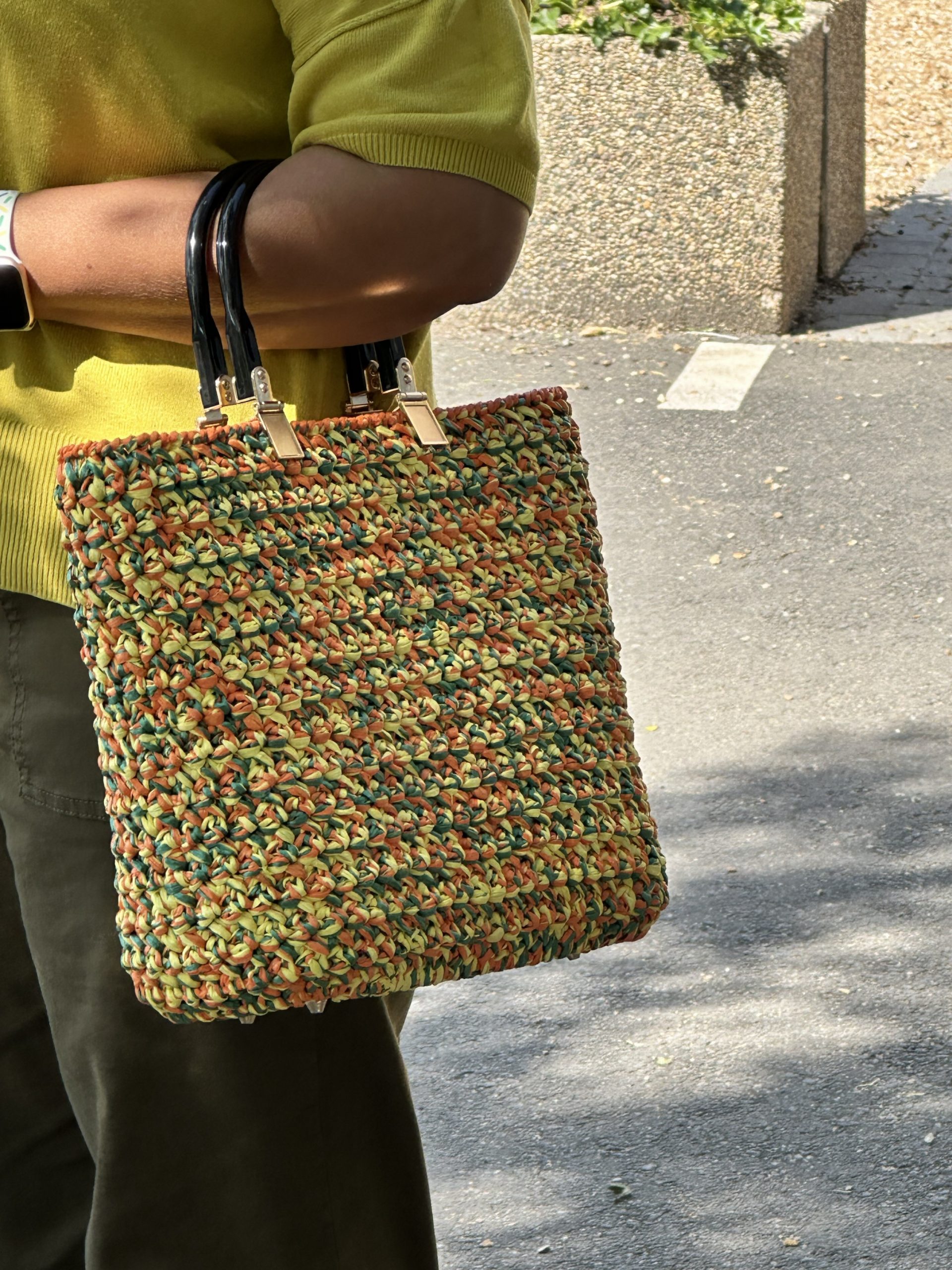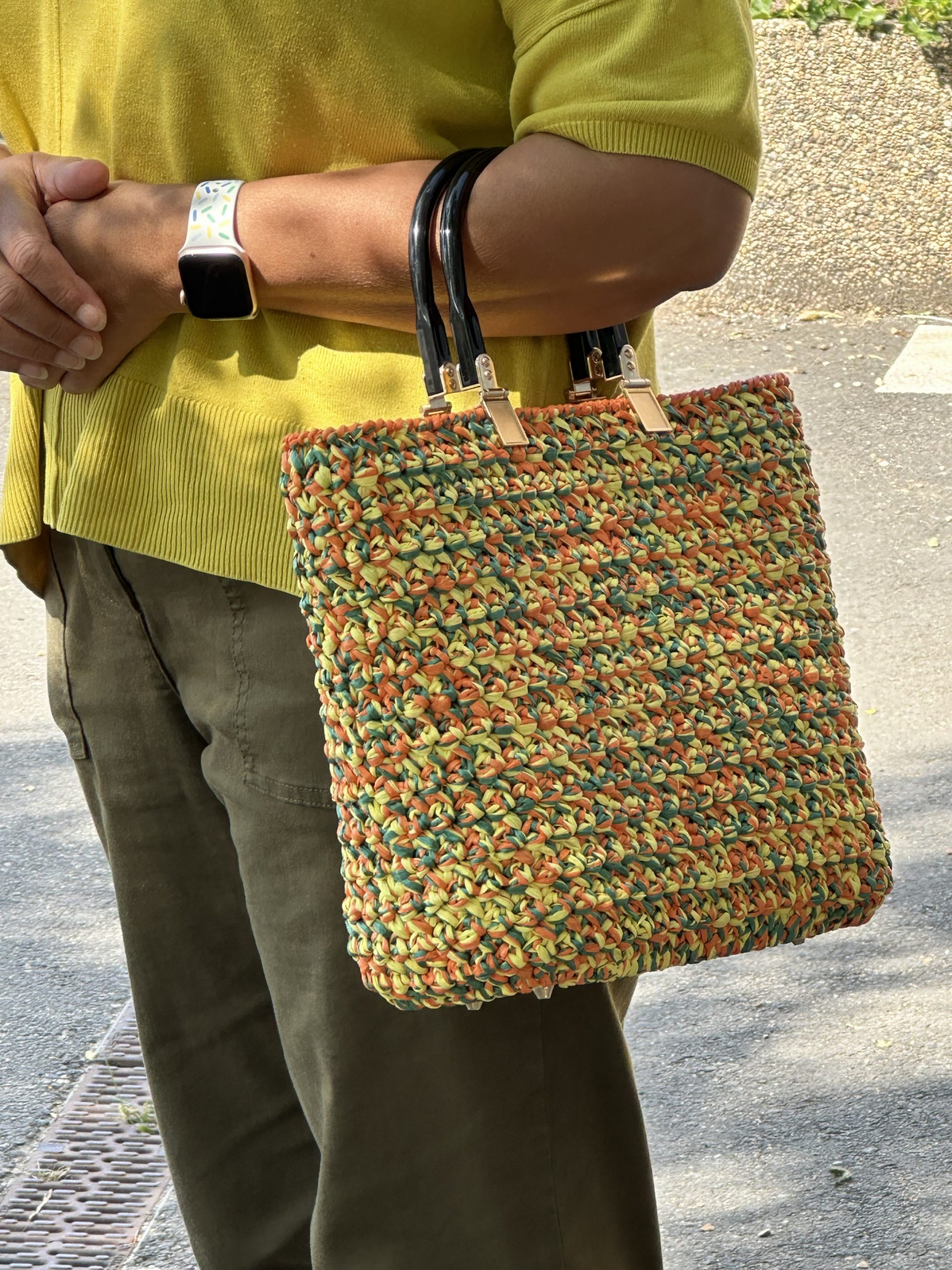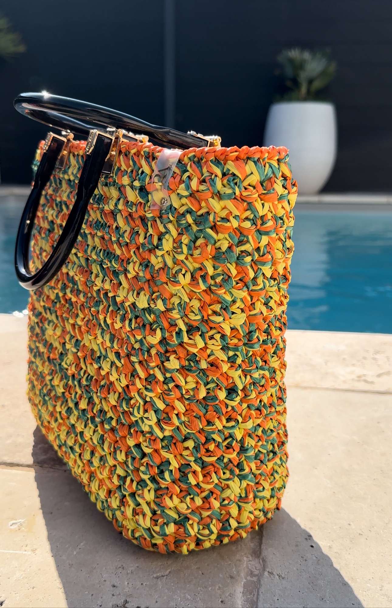 Découvrez « Samba en raphia », un sac naturellement élégant et audacieux, parfait pour un style chic et coloré. Ce modèle unique, mesurant 40×30 cm, est confectionné à la main avec du raphia naturel de haute qualité, dans des nuances vibrantes de jaune, orange et vert. Idéal pour ajouter une touche de sophistication à n’importe quelle tenue, que ce soit pour une sortie décontractée ou une occasion spéciale.