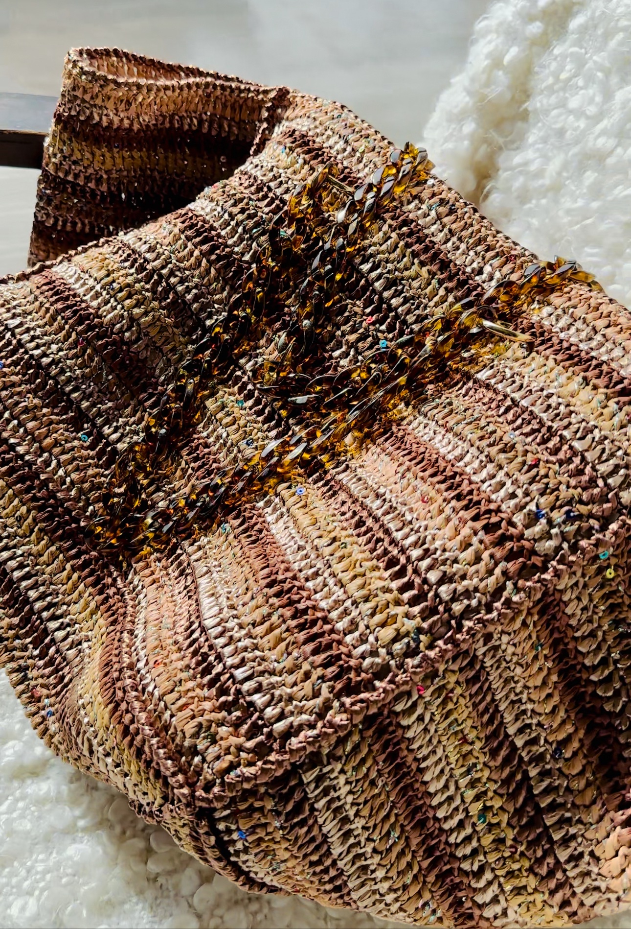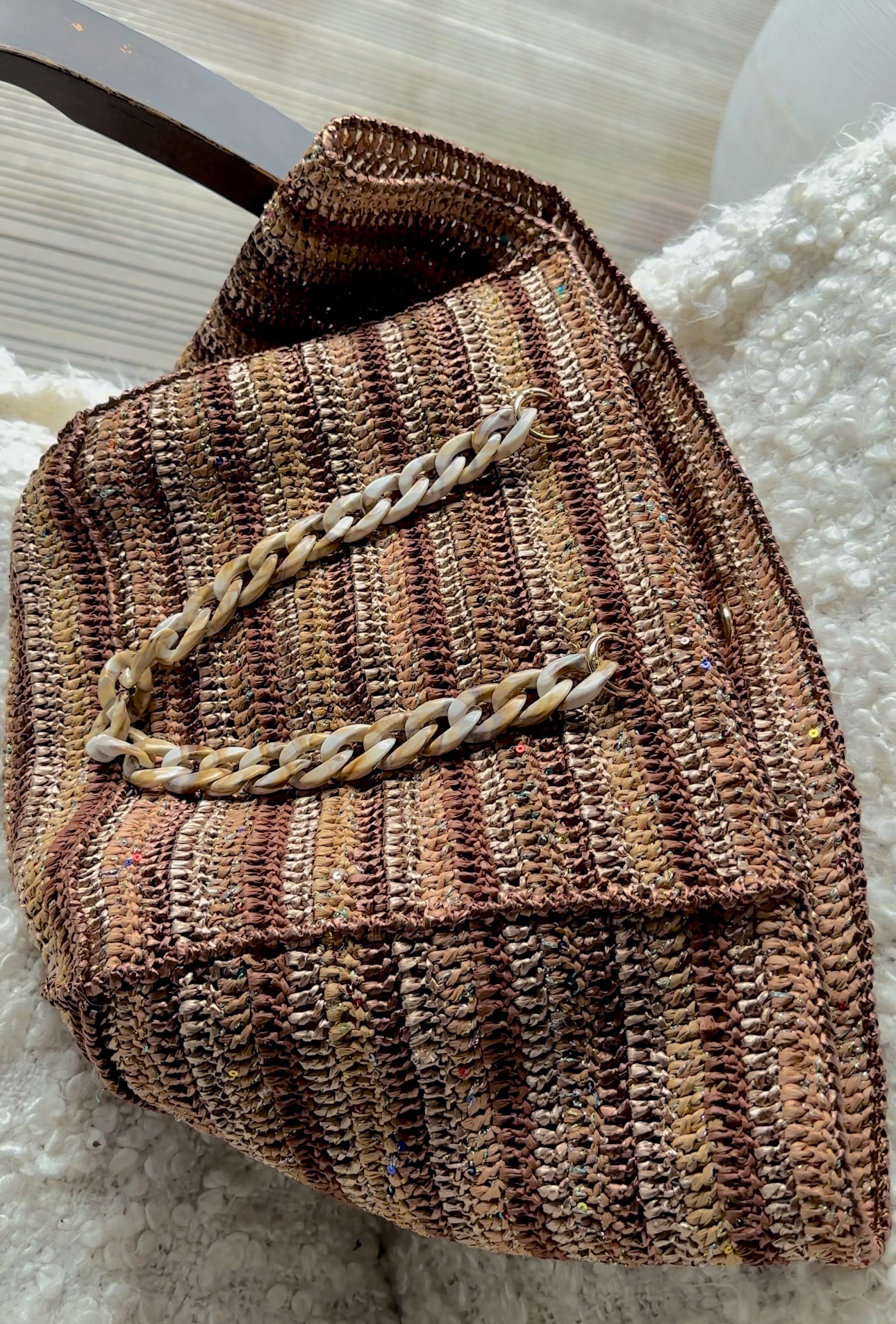 Avec sa taille idéale de 63×42, il offre amplement d’espace pour ranger vos essentiels quotidiens tout en restant facile à porter. Doté de deux anses en cuir, chaînette ou resine, il peut être élégamment porté à l’épaule, ajoutant une touche de sophistication à votre tenue.