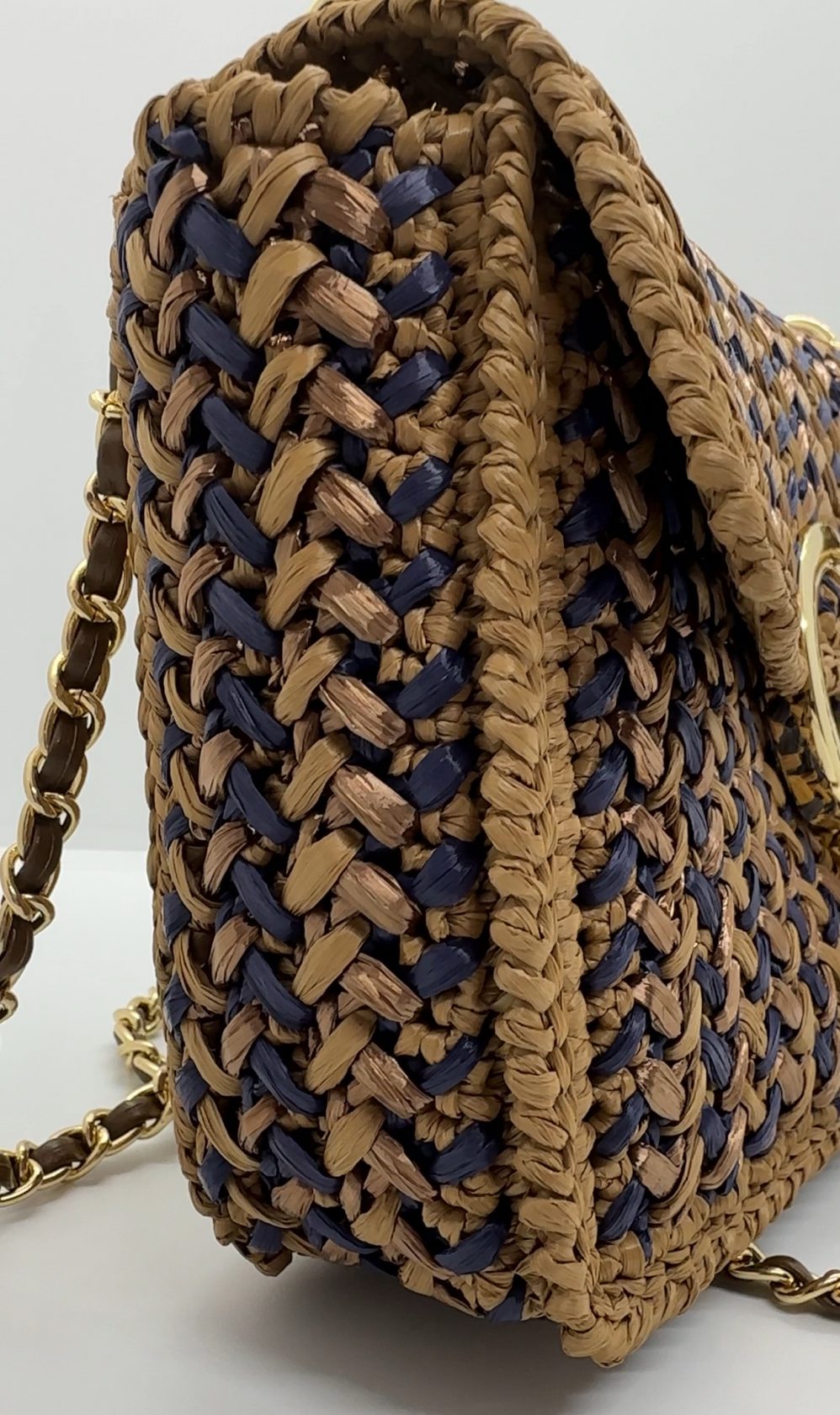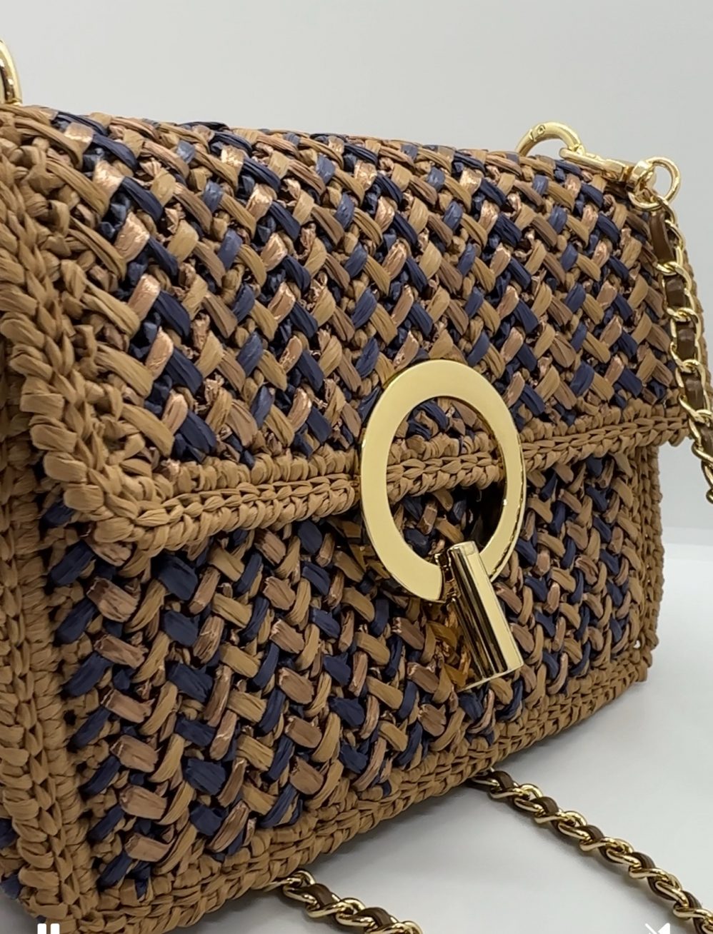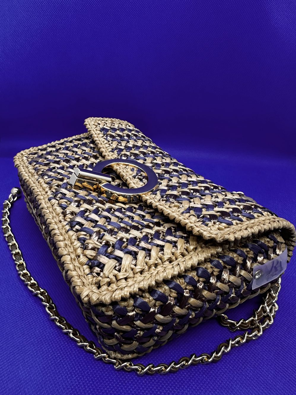 Le sac est conçu avec une base en raphia, ajoutant une touche naturelle et authentique à son design. La bandoulière en chaîne dorée apporte une note de sophistication, tandis que le fermoir rond ajoute une touche finale élégante. Si vous préférez une option rectangulaire pour le fermoir, il vous suffit de nous contacter et nous serons ravis de répondre à votre demande.