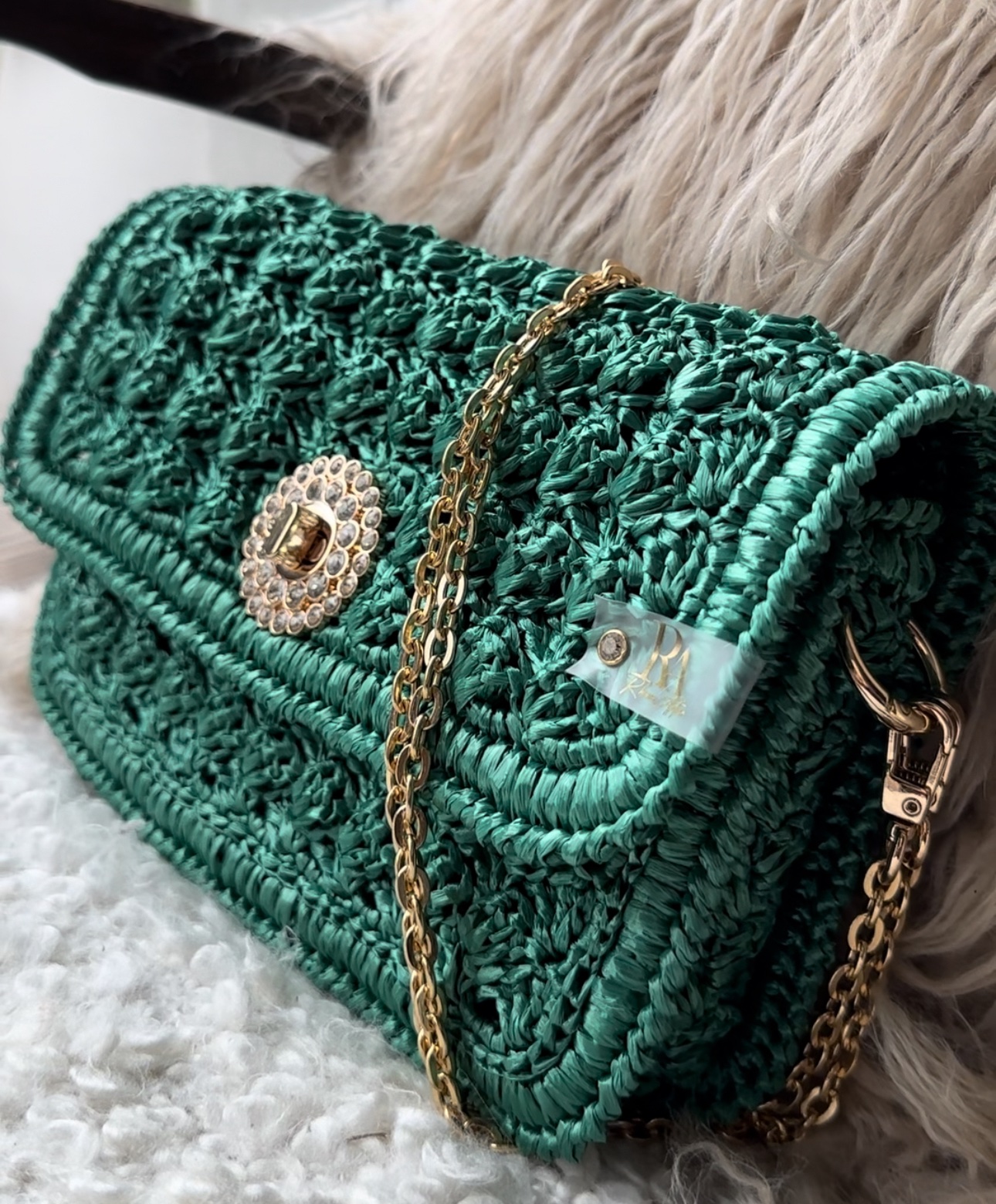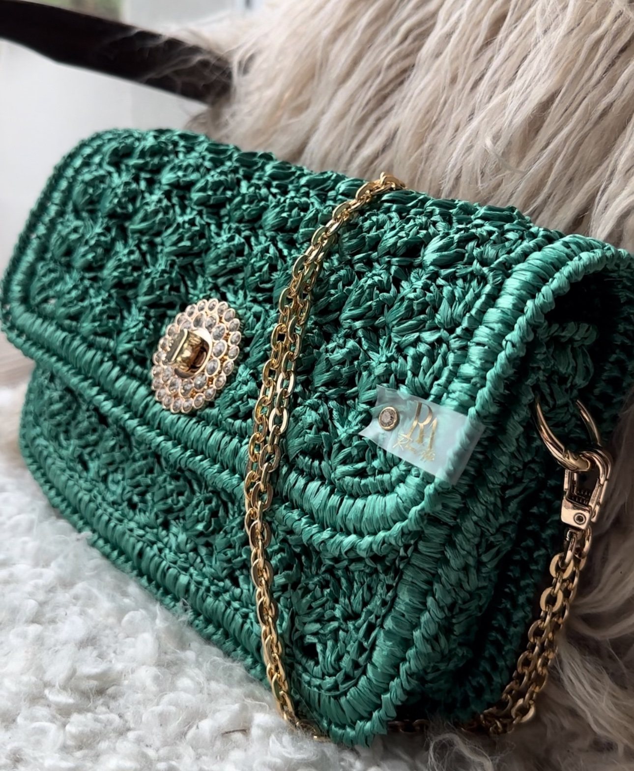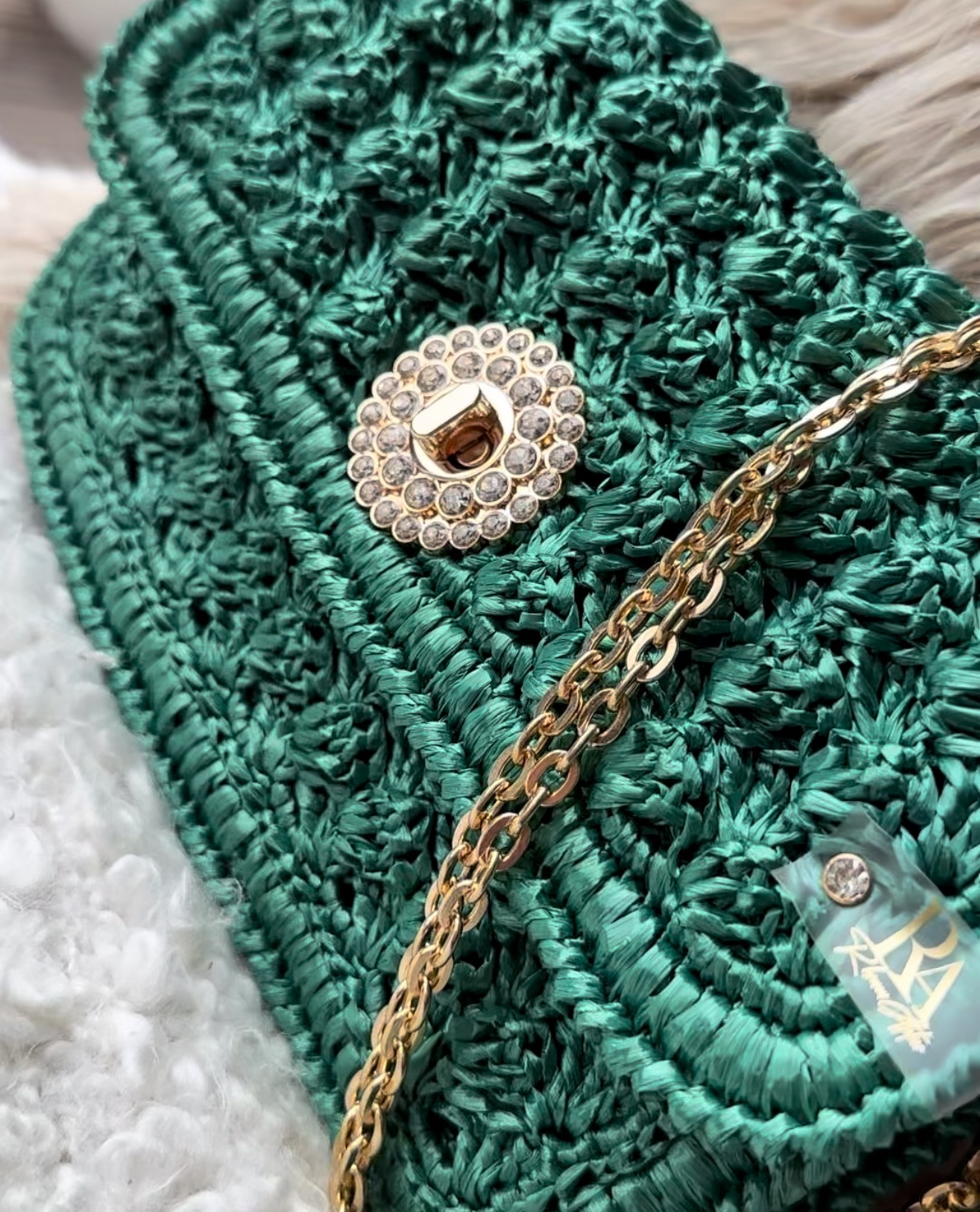 Découvrez le magnifique sac à main ‘Céleste Émeraude ‘ de notre collection Céleste. Ce sac exquis incarne l’élégance et le glamour intemporels. Fabriqué à la main avec un savoir-faire artisanal, il allie parfaitement le charme du raphia et l’audace du vert Émeraude.